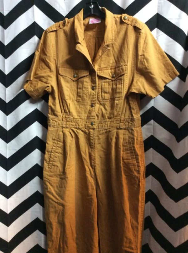 Jumpsuit, short sleeves, button-up, shoulder epaulettes, elastic waist, mustard-yellow, size L
