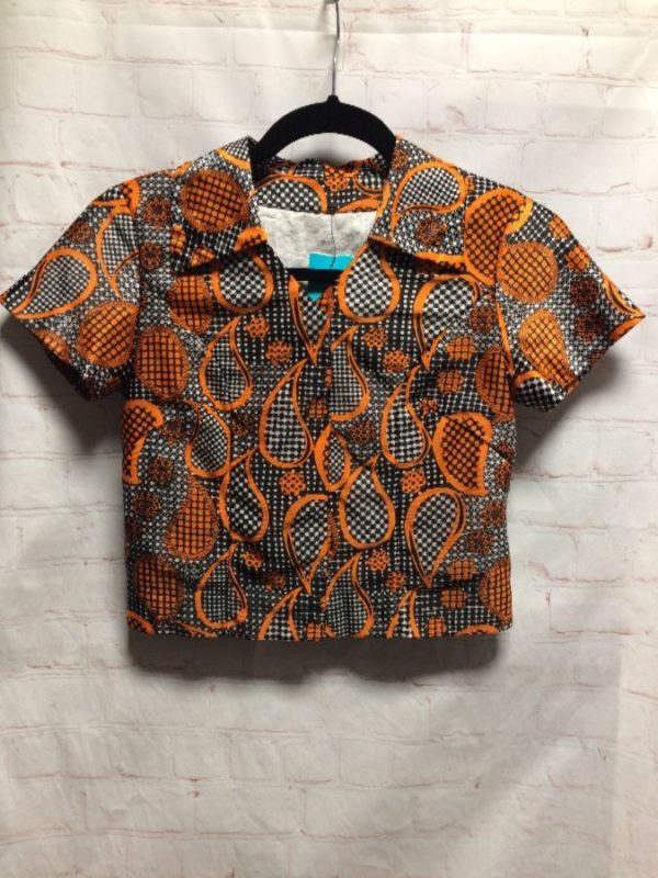 Shirt, short sleeves, button-up with snaps, collar, tear drops/checks & dots geometric print, neon colors, neon-orange/black/white, size S