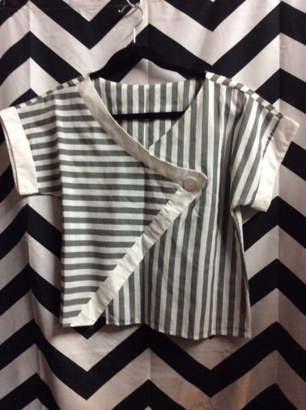 EARLY 1980’S SHIRT, SHORT SLEEVES, VERTICAL STRIPES WITH HORIZONTAL STRIPED TRIANGLE FRONT CLOSURE, WHITE/GRAY