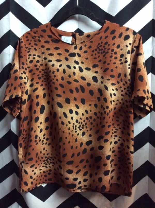 Pullover top, short sleeves, zip-up back neck, Leopard print design, brown/tan/black, size M