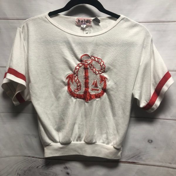 Heidi top, short sleeves, pullover, striped sleeves, front anchor appliqued design with added mesh interior detail, white/red, size S