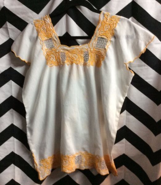 Mexican style top, short sleeves, pullover, embroidered neck and bottom, white/yellow