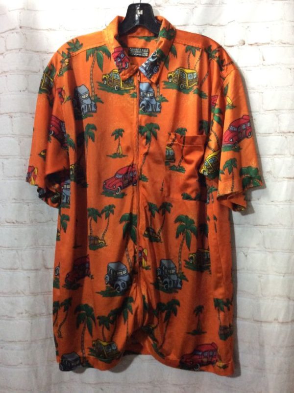 Priority Male Hawaiian shirt, polyester, short sleeves, zip-up, classic car(Woody & surfboard) & palm trees pattern, orange/green/blue/red/yellow, size L