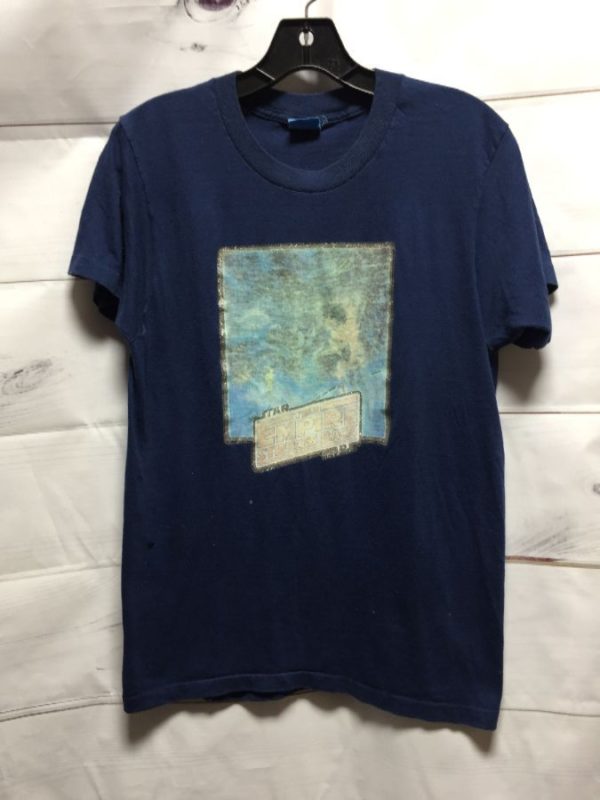 SUPER RETRO +SCREEN STARS T-SHIRT, STAR WARS, THE EMPIRE STRIKES BACK, FRONT GLITTER HEAT TRANSFER, FADED & WORN, DARK BLUE/PALE BLUE/OFF WHITE, SIZE M AS IS