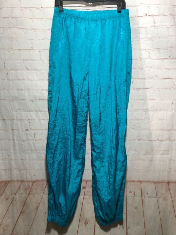 Starter windbreaker warm-up pants, nylon, elastic waist with drawstring, gathered ankles, embroidered logos down front left side & under back right zippered pocket, teal, size S