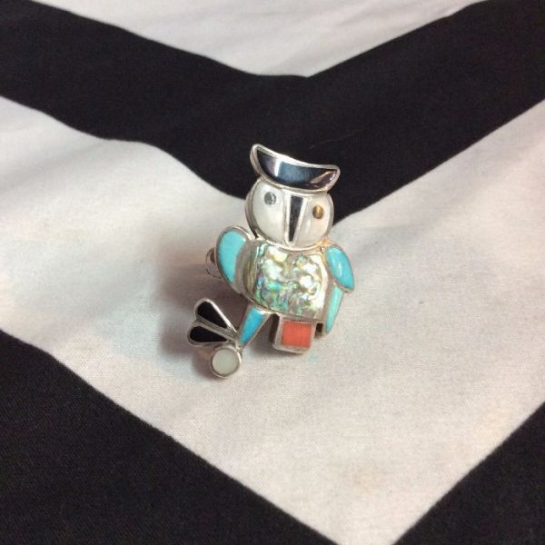 Ring, sterling silver, owl design, inlay (turq, coral, onyx, abalone), silver/black/white/coral/turq, size 6