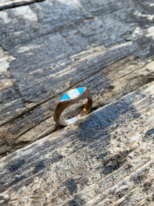 STERLING SILVER MARQUISE SHAPED DESIGN RING INLAY TURQUOISE & MOTHER OF PEARL STONES *STAMPED
