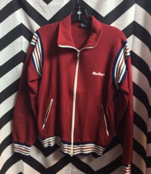 Mac Gregor track jacket, zip-up, stripe design on sleeves/hem/cuffs, dark red/blue/white, size S
