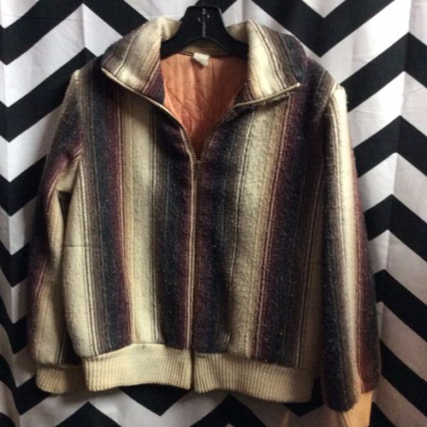 Jacket, zip-up, wooly fabric, vertical stripe design, creme/beige/brown as is