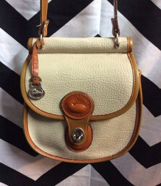 Dooney & Bourke leather purse, structured, cross-body style, long strap, creme/tan as is
