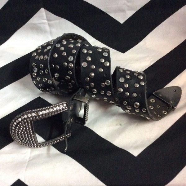 BELT – LEATHER – HEAVILY STUDDED W/RHINESTONES – SILVER BUCKLE & END TIP