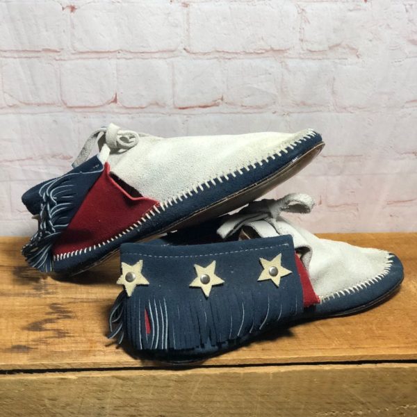 Moccasins, suede leather, front tie, hard sole, patchwork American flag design, fringe around lower back, stars with silver center, red/white/blue/silver, size 10