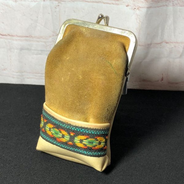Pocket cigarette pouch/coin purse, tanned leather & suede pouch, silver metal, snap closure, IKat decorative band, beige/creme/teal/black/yellow/orange/silver, size 5″L x 3.25″W x 1.5″D As is