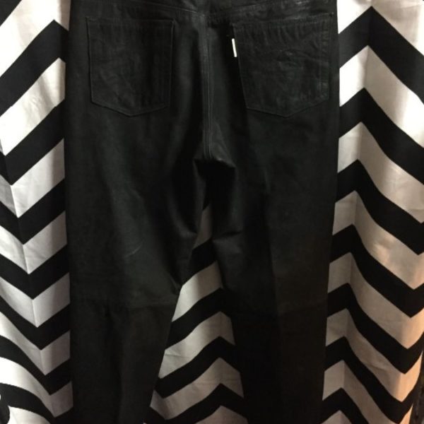 2BU pants, brushed suede leather, button-up fly, pockets in front & back, black, size 33