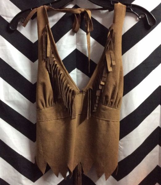 Handmade halter top, suede, leather, fringe around neck, tied in back, brown