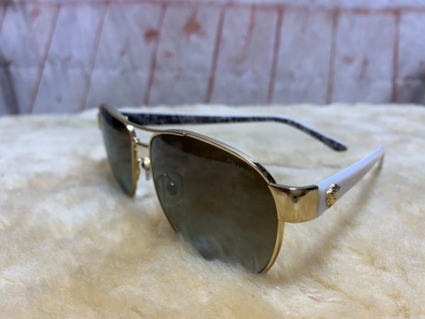 Sunglasses, faux Versace, Aviator style, metal & plastic frames, cool colored polarized lenses, pale blue/gold/dark gray, size one size