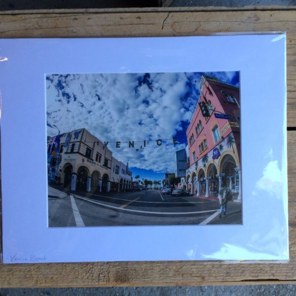 Venice Beach Photos mounted photograph, Sunny California, famous Venice overhead sign with cloudy skies, local photographer Ray Rae, blue/white/peach/black/gray/tan, size 10″ x 13″