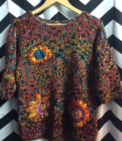 Pullover sweater, short sleeves, super chunky knit, applique sunflowers, rust/orange/multi-color