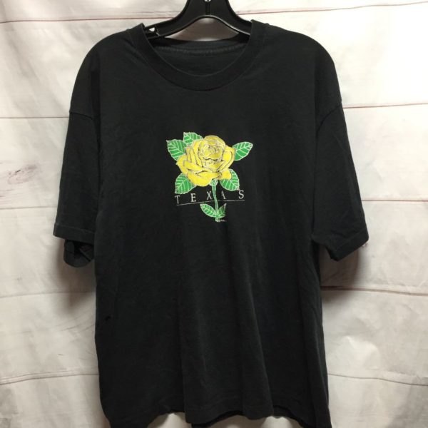 T-SHIRT, YELLOW ROSE, TEXAS, SCREEN PRINTED FLOWER & LETTERING, BLACK/YELLOW/GREEN, SIZE L