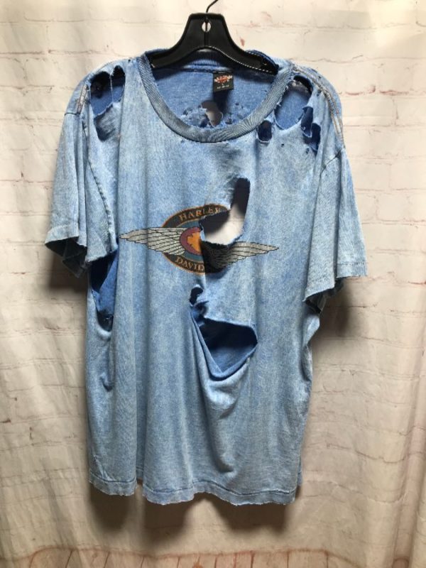 Harley Davidson T-shirt, cotton, Harley Davidson, New York City, screen printed front graphic, super distressed/holes, light blue/gray/white/orange, size one size As is