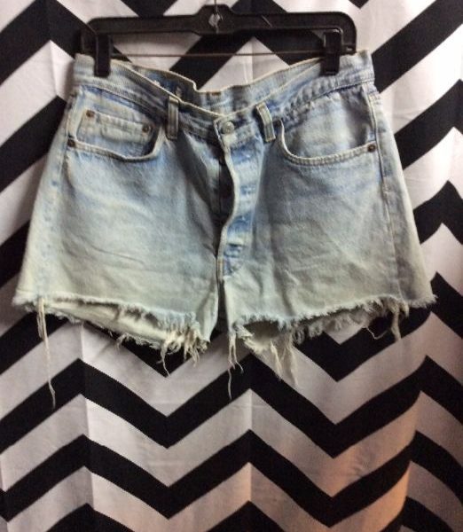 Levis denim shorts, cutoff, orange tab, super frayed & ripped, zip-up, acid washed, light blue, size 28-29