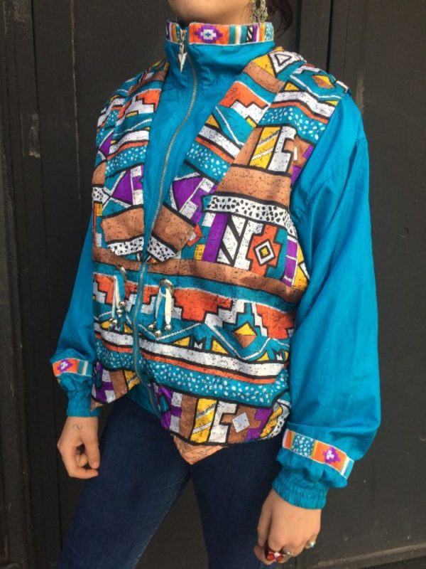 FUNKY ABSTRACT AZTEC DESIGN WINDBREAKER W/ HIGH COLLAR & ARROWHEAD ZIPPER PULL