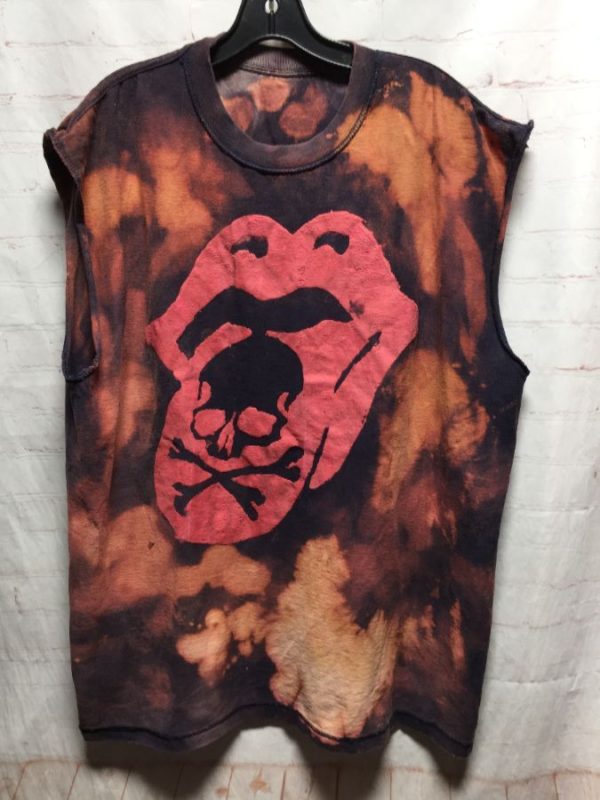 Shaka T-shirt, sleeveless with cut-out sleeves, inside out design, bleach look tie-dyed, Rolling Stones, screen printed tongue with skull & crossbones front design & band name on back, black/brown/orange/pink, size 2XL super oversized
