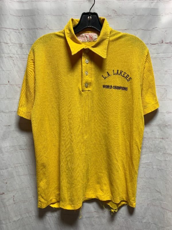 Super Retro W.A, Goodman & Sons shirt, polo style, pullover, short sleeves, 1/4 button-up neck, collar, Los Angeles Lakers, World Champions, screen printed lettering on left chest, distressed, yellow/blue, size L