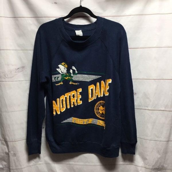 Super retro sweatshirt, pullover, crew-neck, Notre Dame, Fighting Irish, screen printed front design with Leprechaun, navy blue/orange, size S