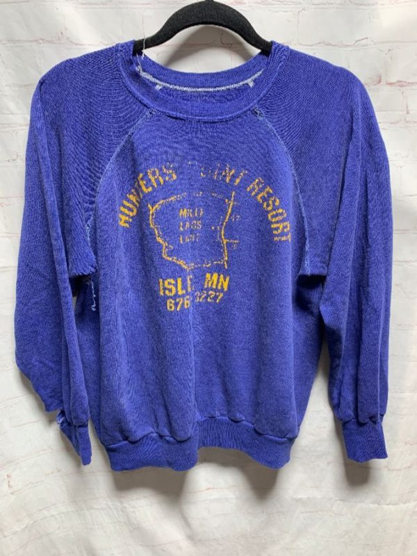 Super retro sweatshirt, pullover, crew-neck, Hunters Point Resort, Isle MN, 676-3227, screen printed front design, tattered, blue/yellow, size M As is