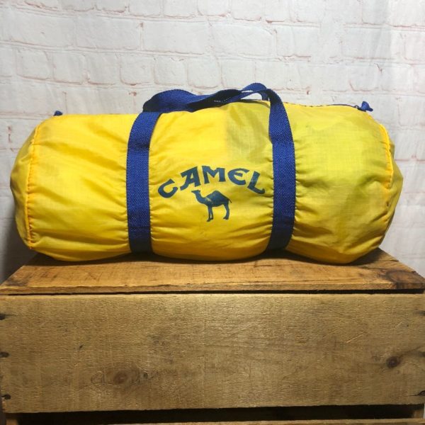Super retro Camel duffel bag, mini sized, 2 toned color scheme, screen printed camel with lettering, zip-up, double handles, yellow/blue, size 9″W x 17.5″L