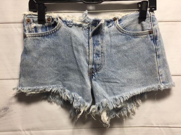 LEVIS DENIM SHORTS, CUT-OFF, SUPER SHORT BOOTY CUT, BUTTON-FLY, CUT WAIST, ACID WASHED, MEDIUM BLUE, SIZE 28W