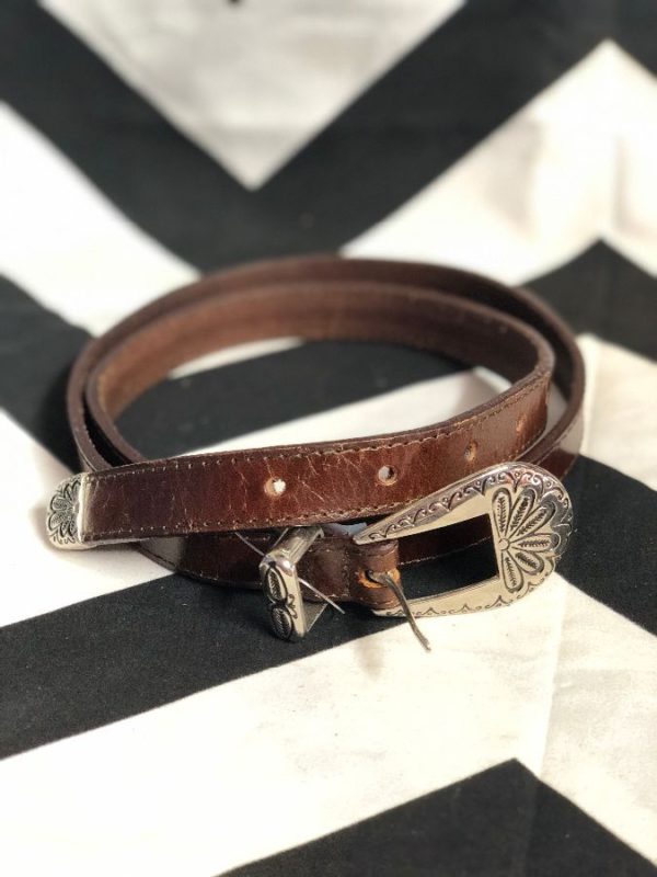 Milor belt, leather, super skinny, shiny ornate silver buckle & tips, brown/silver, size L