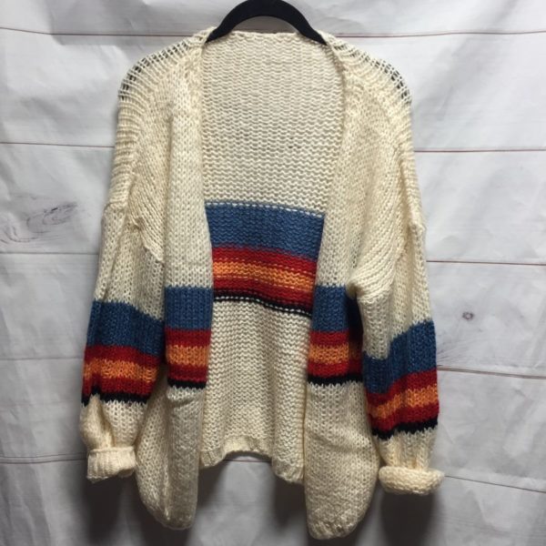 1970’S CARDIGAN SWEATER, KNIT, OPEN FRONT, SUPER SOFT, CENTRAL HORIZONTAL MULTI-COLORED STRIPES ACROSS BODY & SLEEVES, WHITE, SIZE ONE SIZE FITS ALL