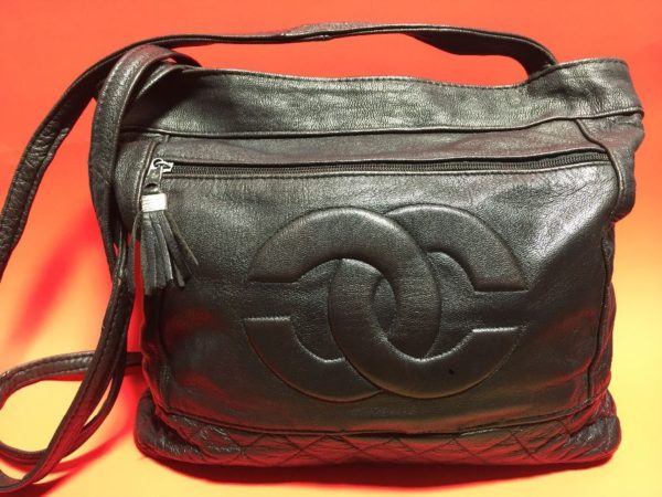 VINTAGE CHANEL STYLE TOTE BAG, GENUINE LEATHER, SUPER SOFT, TOP AND SIDE ZIPPERED COMPARTMENTS, EMBOSSED CC LOGO ON SIDE, TWO NON-ADJUSTABLE STRAPS, BLACK AS IS *IMPERFECT BUT GOOD CONDITION. FAUX?