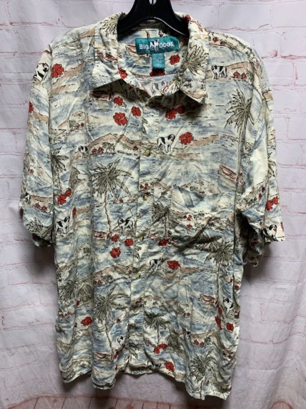 Big Dogs Hawaiian shirt, cotton, short sleeves, button-up, super soft, dogs/palm trees/beach all over print, red/creme/black/blue/beige, size XXL