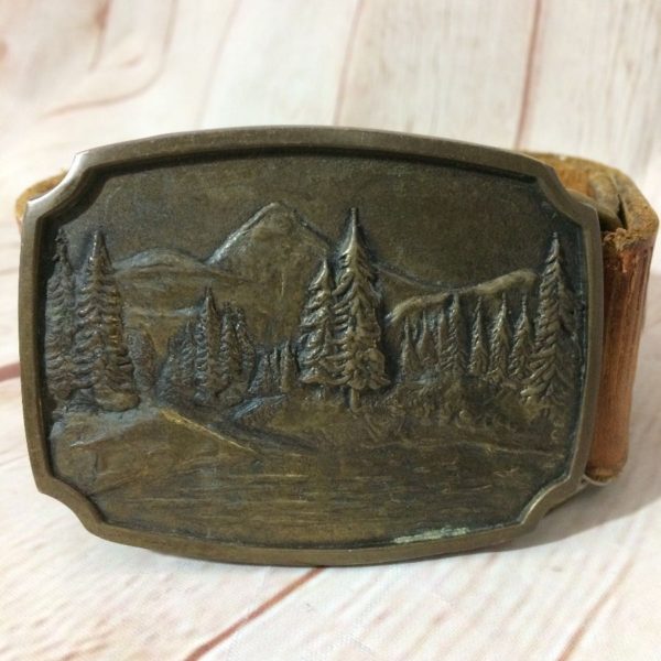 SUPER SOFT EMBOSSED LEATHER BELT HEAVY BRASS BUCKLE W/ WOODS & MOUNTAIN SCENE