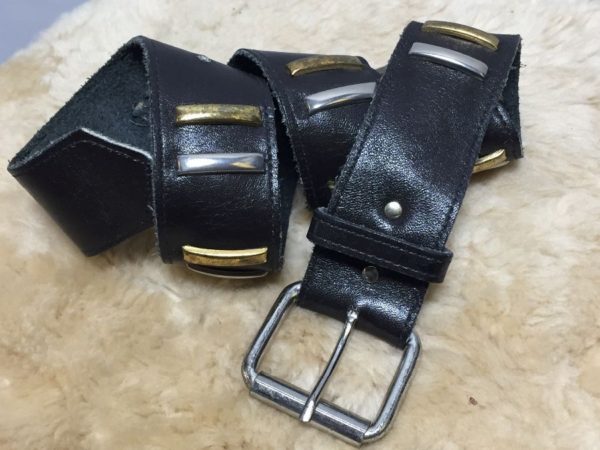 Belt, super soft leather, vertical metal bar studs & square shaped buckle, black/silver/gold, size XS