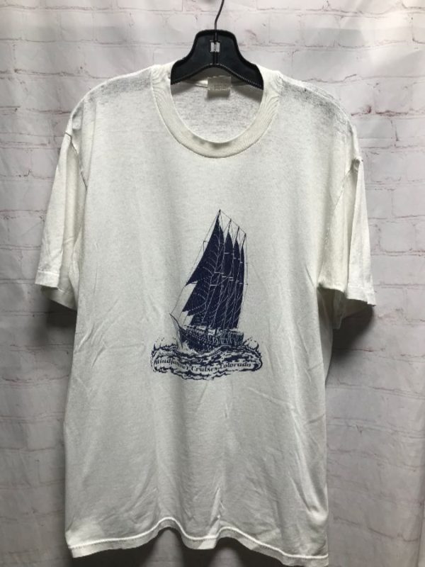 Stedman T-shirt, super soft, Windjammer Cruises – Colorado, screen printed front sailboat graphic, white/navy blue, size L