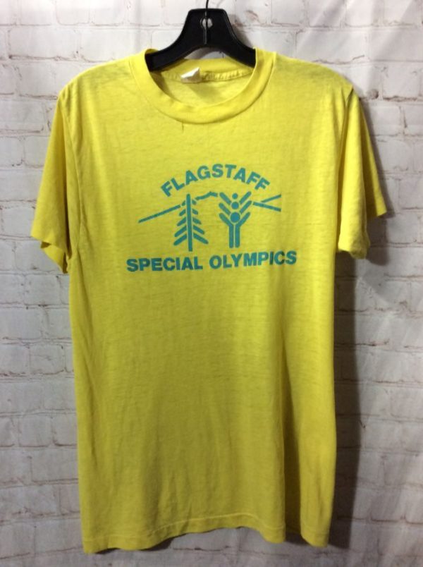 RETRO CHED T-SHIRT, 50/50 BLEND, SUPER SOFTY, SCREEN PRINTED FLAGSTAFF SPECIAL OLYMPICS FRONT DESIGN, YELLOW/BLUE, SIZE S AS IS
