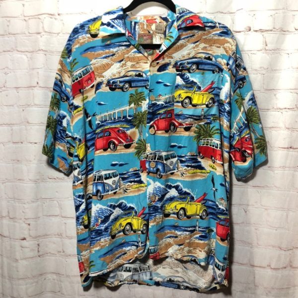 SS BD HAWAIIAN SHIRT VW VOLKSWAGEN CARS AND SURF SIDE BEACH SCENE