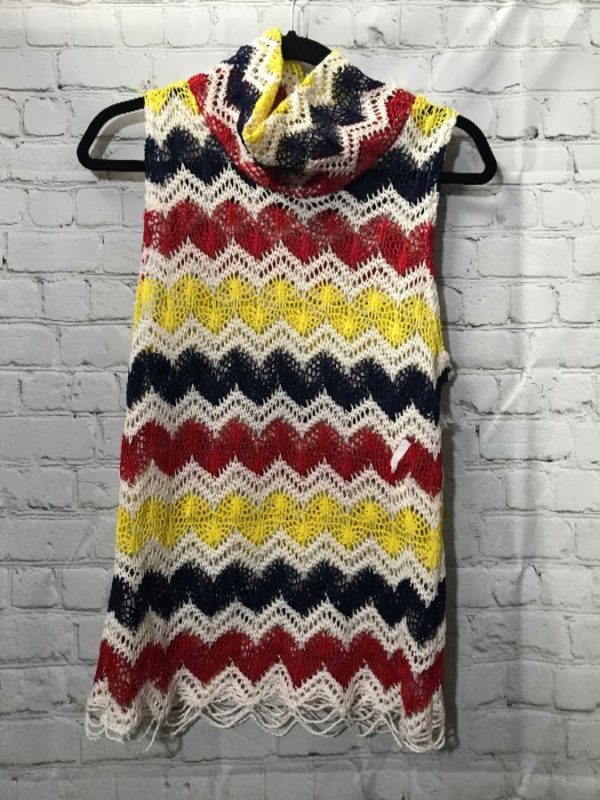 CROCHET SWEATER VEST, MISSONI STYLE, COWL NECK, CHEVRON ZIG-ZAG PATTERN, WHITE/BLACK/RED/YELLOW, SIZE M