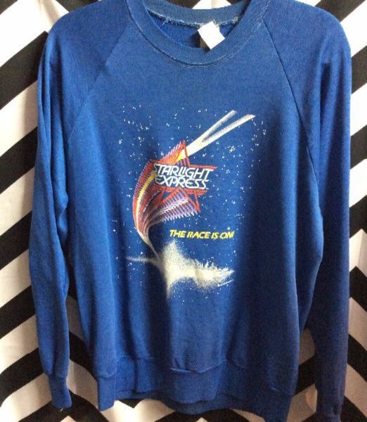 STARLIGHT EXPRESS PULLOVER SWEATSHIRT, THE RACE IS ON, LONG SLEEVES, SCREEN PRINTED DESIGN FULL FRONT, BLUE, SIZE M