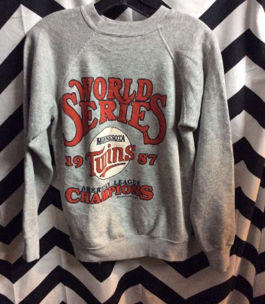 1987 Minnesota Twins pullover sweatshirt, World Series, heather gray/red/white, size S
