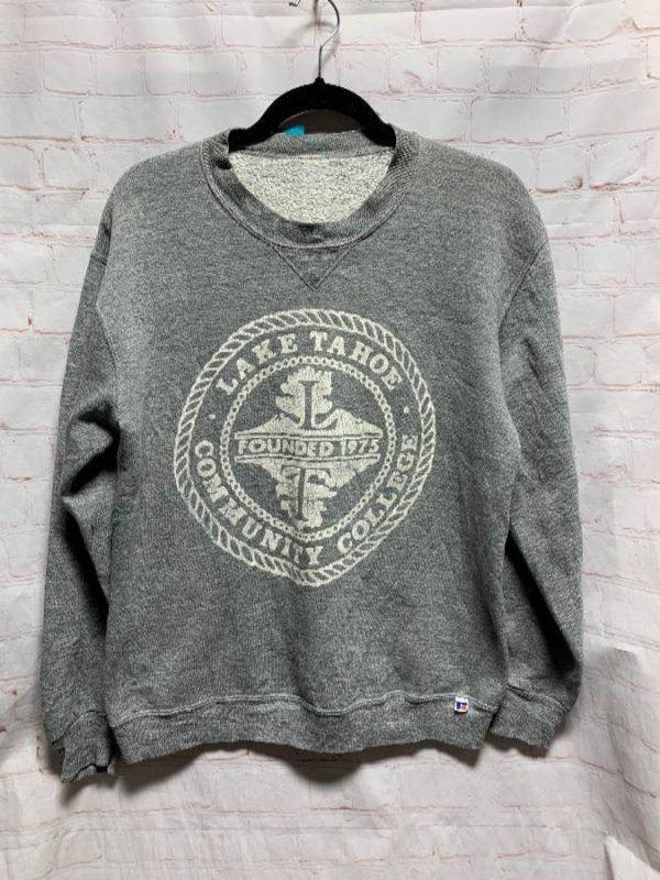 Russell Athletic Sportswear sweatshirt, pullover, crew-neck, Lake Tahoe Community College, screen printed front logo, gray/white