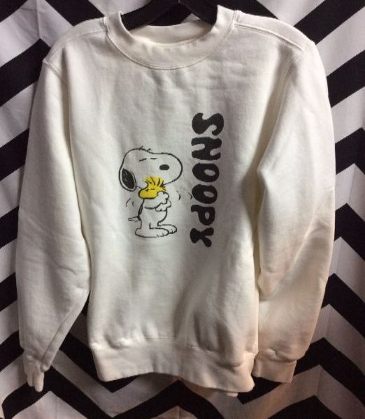 Pullover sweatshirt, screen printed Snoopy & Woodstock design, white/black, size S as is