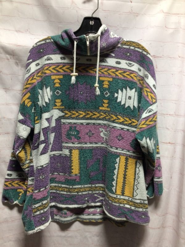 SWEATSHIRT TERRY CLOTH AZTEC PRINTS ZIP-UP HOOD W/ DRAWSTRING & CUT SLEEVES