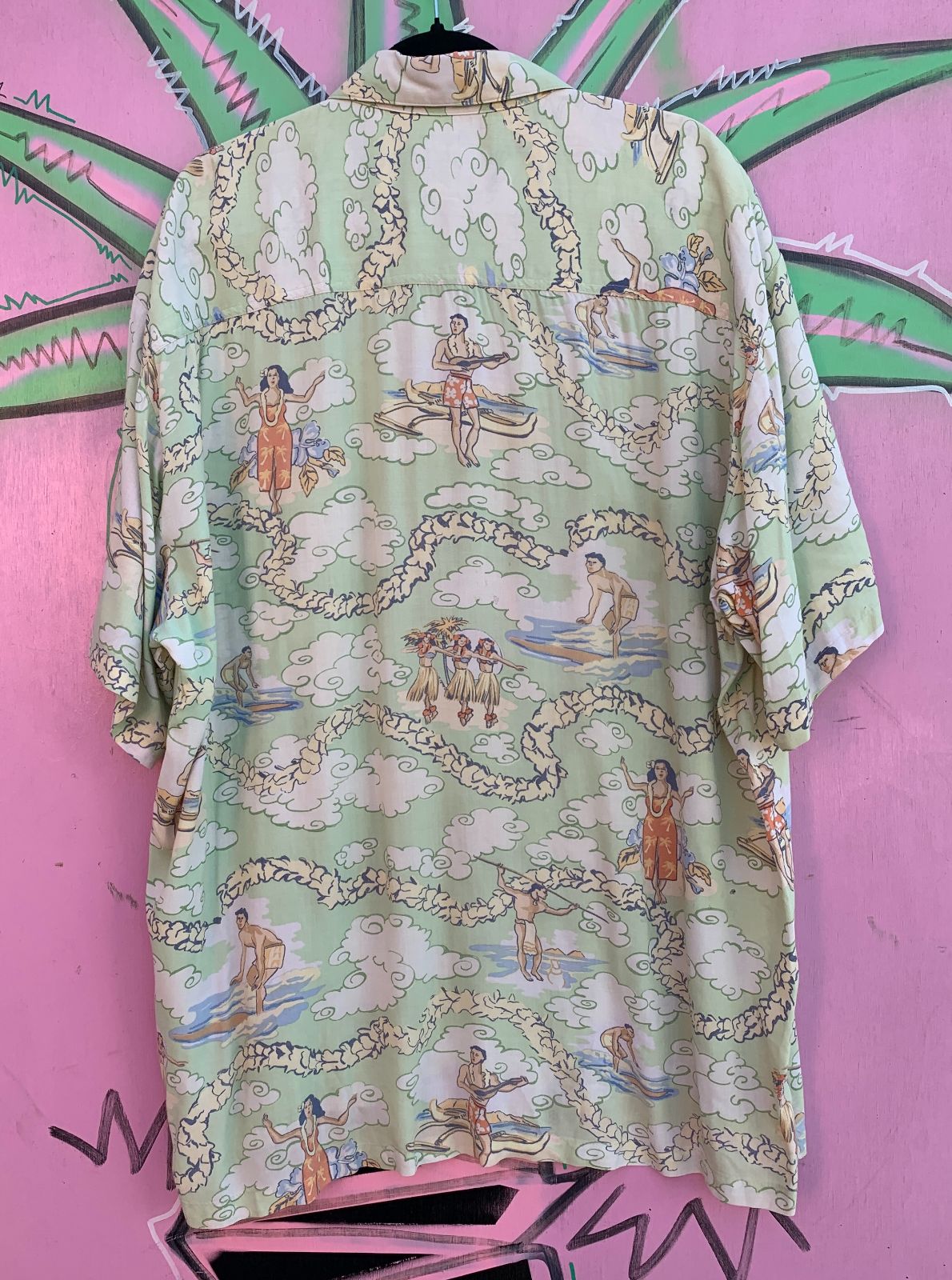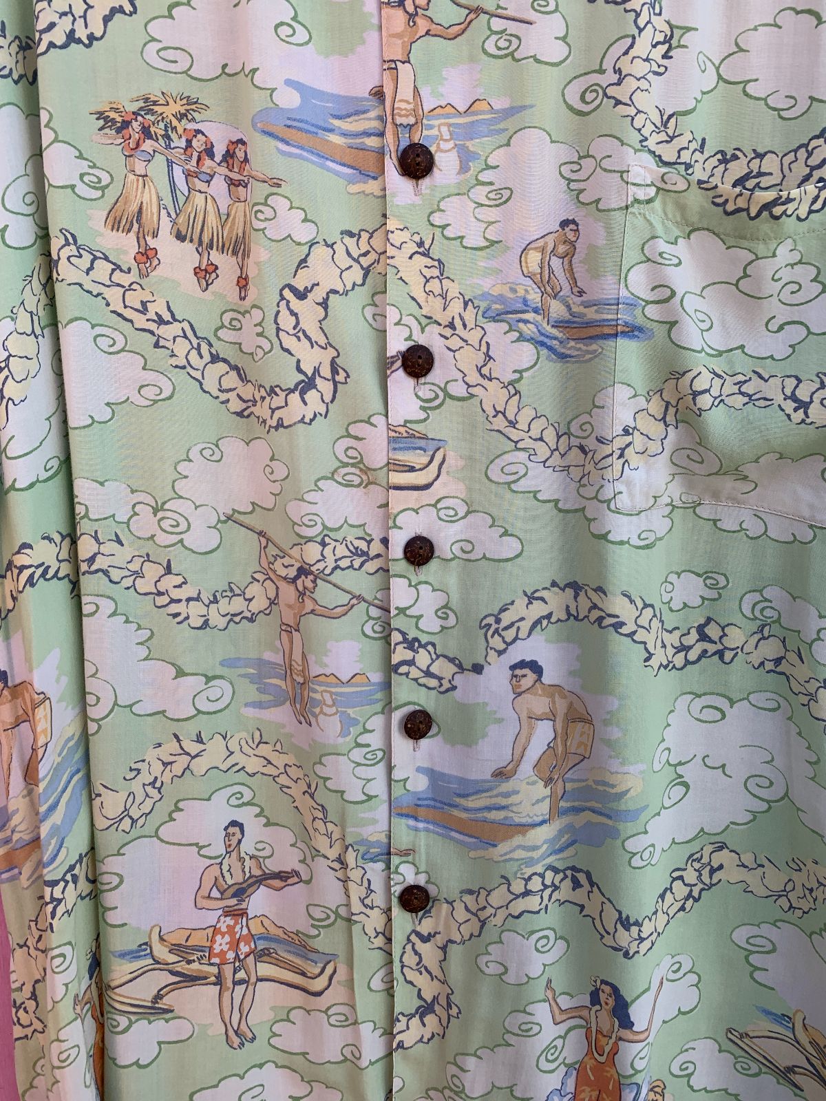 SWEET! 100% RAYON, RETRO CLOUDS & SURF PRINT HAWAIIAN SHIRT, COCONUT BUTTONS