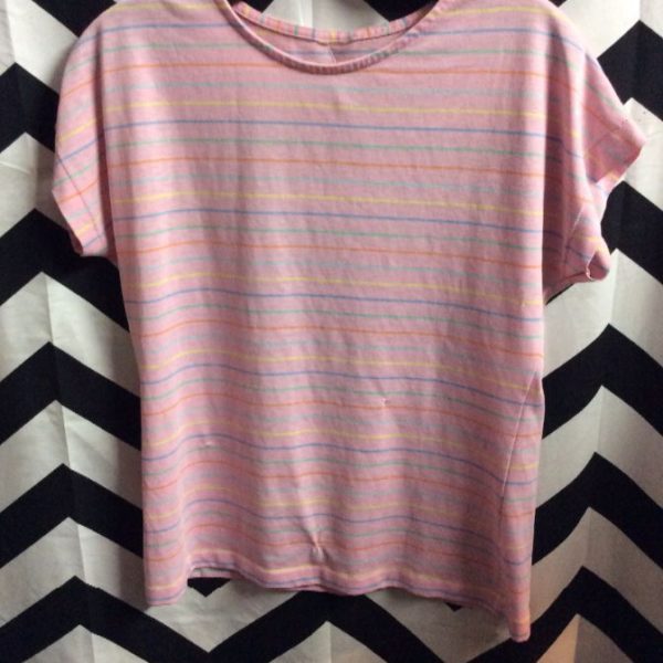 1980’s T-shirt, rainbow colored horizontal stripes, pink/multi