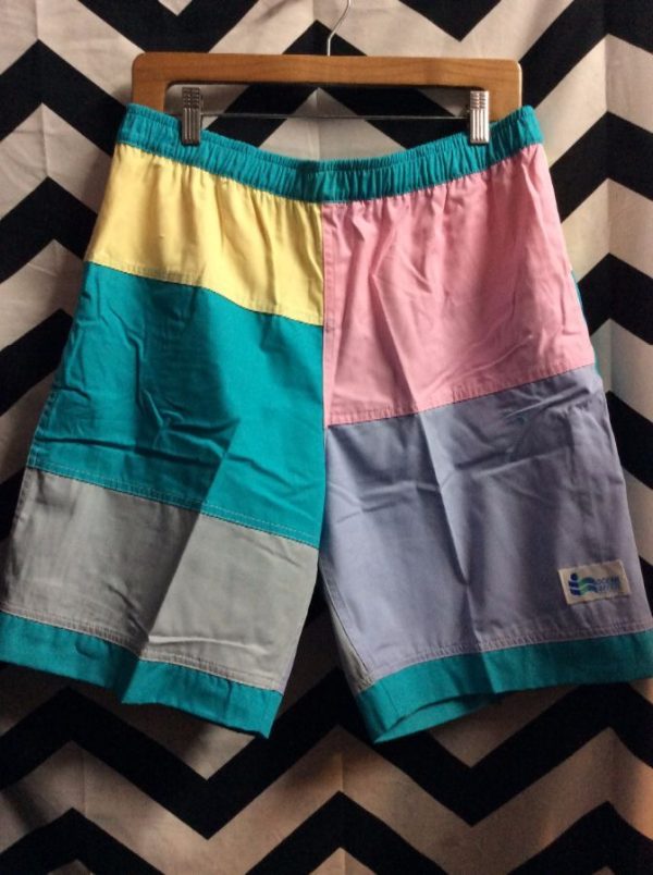Ocean Breeze swim shorts, elastic waist, pastel colors, color block design, deadstock, pink/yellow/green/lavender/gray, size 36W